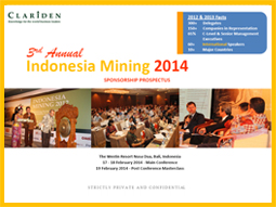 Following the success of Indonesia Mining 2013, Clariden Global is pleased to present the 3rd Annual Indonesia Mining 2014 Conference as a key platform for mining stakeholders to share practical & frank discussions on managing regulatory uncertainties & realizing strategic commercial, financing & operational opportunities. |